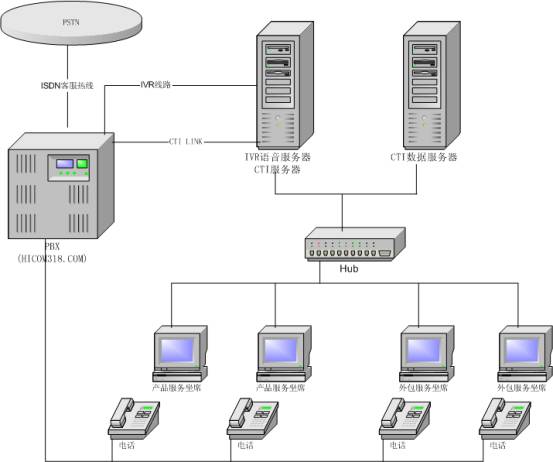 系統(tǒng)是由一臺Siemens Hicom318.com交換機,一臺CTI,IVR語音服務(wù)器,一臺CTI數(shù)據(jù)庫服務(wù)器構(gòu)成。系統(tǒng)的連接方式如上圖。系統(tǒng)目前共設(shè)置了8個人工座席,根據(jù)業(yè)務(wù)的不同分為產(chǎn)品服務(wù)座席和外包服務(wù)座席,每人工座席有電腦一臺,Siemens數(shù)字話機一部。人工座席的電腦與CTI,IVR語音服務(wù)器及CTI數(shù)據(jù)庫服務(wù)器共處一個局域網(wǎng)內(nèi)。