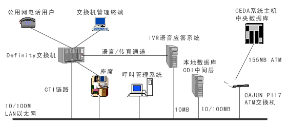 浦東機場呼叫中心系統(tǒng)建有本地數(shù)據(jù)庫,但有許多信息需與中央數(shù)據(jù)庫交換。所以依托高速的ATM主干網(wǎng)絡(luò),利用基于TCP/IP網(wǎng)絡(luò)協(xié)議的CDI(CEDA Data Interface)通信方式作為中間件,進行本地數(shù)據(jù)庫與中央數(shù)據(jù)庫之間的信息交互和共享,完成本系統(tǒng)與機場信息集成系統(tǒng)的中央數(shù)據(jù)庫連通。