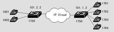 在該案例中,異地之間通過兩臺DCR 1750互連,并提供語音模塊,可直接接電話機(jī),使得異地之間可以通過IP網(wǎng)絡(luò)撥打IP語音電話。