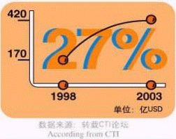 - 據(jù)CTI論壇轉(zhuǎn)引有關(guān)統(tǒng)計(jì)數(shù)字表明,全球呼叫中心外包市場(chǎng)1998年的產(chǎn)值為170億美元,2003年有望達(dá)到420億美元,并正以每年遞增27%的速度快增長(zhǎng);