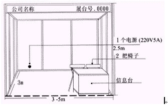 標(biāo)準(zhǔn)展臺價格包括三面墻板(邊角展臺為兩面墻板)、楣板及中英文公司名稱、5安培電源、地毯、兩只日光燈(15平方米展臺為三只日光燈)、一個信息臺、兩把椅子、一個廢紙簍。