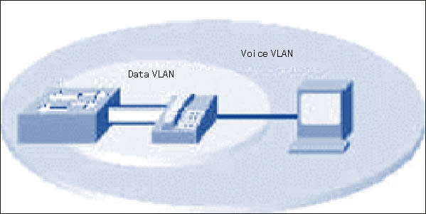 由于QoS、可擴(kuò)展性、可管理性和安全性等原因,IP電話設(shè)備和IP數(shù)據(jù)設(shè)備應(yīng)該部署在兩個(gè)邏輯上獨(dú)立的網(wǎng)段中。將IP語(yǔ)音與傳統(tǒng)IP數(shù)據(jù)網(wǎng)分離能大大提高抗攻擊能力,而且允許使用相同的接入層、核心層和分布層。