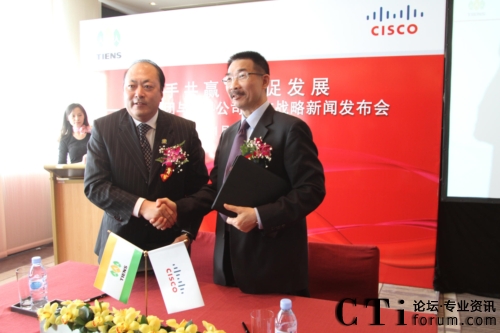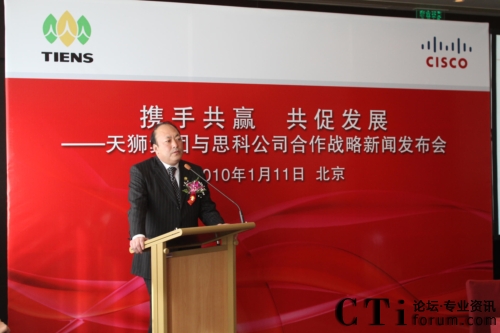CTI論壇(ctiforum)1月12日消息(記者 張塵):2010年1月11日,北京——“攜手共贏 共促發(fā)展——天獅集團與思科公司戰(zhàn)略項目新聞發(fā)布會”在北京召開,雙方共同宣布,天獅集團國際健康產業(yè)園網絡平臺成功啟用,并正式達成合作戰(zhàn)略。天獅集團董事長兼總裁李金元先生與思科全球副總裁、思科中國副董事長兼總裁林正剛先生出席新聞發(fā)布會,并進行簽約儀式。通過本次強強聯(lián)合,思科面向服務的網絡架構(SONA)全面部署于天獅集團國際健康產業(yè)園,為天獅集團業(yè)務的穩(wěn)定持續(xù)發(fā)展以及信息化水平的進一步提升提供了可靠保證,同時也為雙方未來更深層次的合作打下了堅實的基礎。