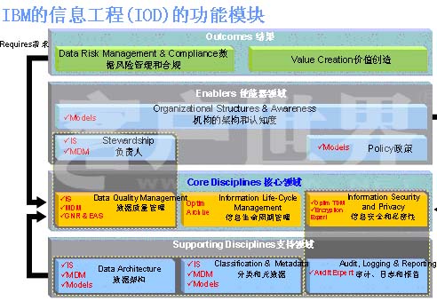 具體一點實際上信息工程分11大模塊,我們從底層往上看,首先是數(shù)據(jù)架構(gòu)、進行分析和定義,而且每個數(shù)據(jù)要進行分類,并且對數(shù)據(jù)源的結(jié)構(gòu)做模型。再往上一點我們可以看到怎么樣去管理生命周期,怎么樣去管理數(shù)據(jù)的質(zhì)量,安全和私密性等等;再往上任何信息的使用一定要有公司的策略,公司是什么策略來管理,什么可以開發(fā)給第三方,可以給呼叫中心做、什么不可以,這些問題都需要考慮。像風險通過BI的方式提供一些有洞察力的洞察報告。