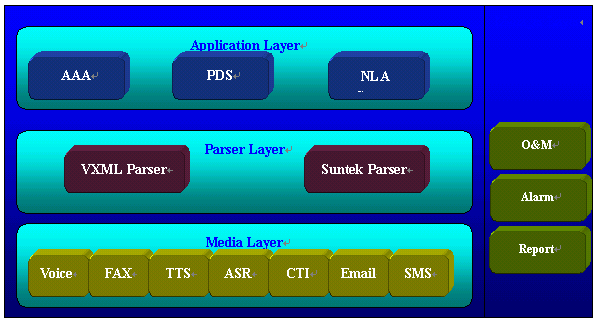 SSurnon-IVR系統(tǒng)分為支撐系統(tǒng)和應用服務器兩大部分,支撐系統(tǒng)的核心為Browser Layer。由它來解釋和執(zhí)行流程的業(yè)務邏輯,由Media Layer提供具體的操作,主要是管理語音、傳真、IP等資源,對Browser Layer屏蔽掉硬件的區(qū)別,提供統(tǒng)一的接口,以插件的形式提供各種功能。在它們之外還有配置管理、維護監(jiān)控、告警管理、統(tǒng)計報表等。應用服務器部分包括外呼管理、數(shù)據(jù)庫中間件,傳真網(wǎng)關、自然語音理解引擎等。具體的結構見下圖: