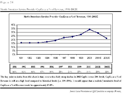 和中國(guó)的問(wèn)題一樣,制造商的問(wèn)題是電信服務(wù)企業(yè),即運(yùn)營(yíng)商的投入減少造成的。由于上世紀(jì)末互聯(lián)網(wǎng)和電子商務(wù)泡沫的虛假繁榮的影響,各運(yùn)營(yíng)商都嚴(yán)重高估了市場(chǎng)需求,認(rèn)為需求是會(huì)隨著通信能力的增強(qiáng)無(wú)限增加,因此市場(chǎng)規(guī)模是會(huì)無(wú)限擴(kuò)張的,他們?cè)谌狈?duì)最終用戶(hù)需求的深入分析的前提下,普遍在基礎(chǔ)設(shè)施的建設(shè)上進(jìn)行了超大規(guī)模的投入,其基礎(chǔ)設(shè)施建設(shè)投入在收入中的比例一度在2000年從平均的15%達(dá)到了創(chuàng)記錄的35%!