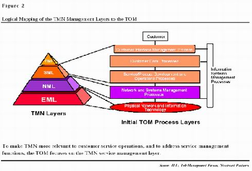 國際電聯(lián)的出發(fā)點(diǎn)雖好,但它更強(qiáng)調(diào)從網(wǎng)絡(luò)元素層開始的清晰的統(tǒng)一體系,而為了保護(hù)自己的商業(yè)秘密,各大運(yùn)營商往往不希望公開自己的網(wǎng)絡(luò)元素層的標(biāo)準(zhǔn),同時(shí),網(wǎng)絡(luò)元素層的標(biāo)準(zhǔn)化對運(yùn)營商的業(yè)務(wù)發(fā)展幫助不大。在熱烈討論了一段時(shí)間之后,TMN漸漸被忽視了。而另一只希望從技術(shù)角度解決管理問題的力量,電信管理論壇,卻帶有一定偶然性地逐漸確立了自己的地位。電信管理論壇在開始的時(shí)候并沒有夢想能建立覆蓋整個(gè)電信運(yùn)營企業(yè)的管理系統(tǒng),其初衷是解決在當(dāng)時(shí)日漸突出的跨企業(yè)的客戶數(shù)據(jù)交換問題。因此,和國際電聯(lián)不同,電信管理論壇從開始就非常強(qiáng)調(diào)實(shí)用性,并把目光集中到了各企業(yè)相互間有大量數(shù)據(jù)交換,因此迫切需要建立標(biāo)準(zhǔn)的服務(wù)管理層和網(wǎng)絡(luò)管理層,并提出了電信運(yùn)營支持系統(tǒng)(OSS)的概念,并公布了模塊化的電信運(yùn)營導(dǎo)圖(TOM)。