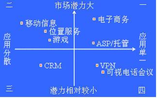 * 第三象限:市場潛力比較小,應(yīng)用比較分散。由于經(jīng)營靈活,貼近客戶,小服務(wù)提供商在此會有非常大的優(yōu)勢。大型運(yùn)營商如想經(jīng)營此象限內(nèi)的業(yè)務(wù),必須努力減小不同用戶需求的差異,并造成成本領(lǐng)先。如客戶關(guān)系管理(CRM)。