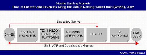 如果市場潛力足夠大,那么選擇適當(dāng)?shù)臉I(yè)務(wù)模式就是實(shí)現(xiàn)市場潛力的保證。而業(yè)務(wù)模式的選擇是與業(yè)務(wù)的市場價(jià)值鏈分不開的。在一些市場價(jià)值鏈較復(fù)雜的應(yīng)用中,業(yè)務(wù)模式的選擇尤為重要,例如,下圖所示的移動游戲的價(jià)值鏈就是較復(fù)雜的一個(gè):