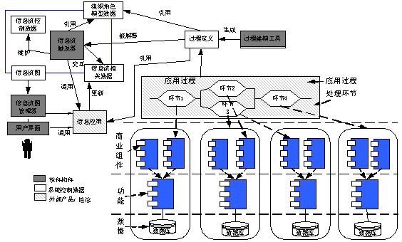 一體化信息平臺的總體結(jié)構(gòu)大體上分為數(shù)據(jù)層、功能、商業(yè)組件、處理環(huán)節(jié)、應(yīng)用過程層,功能層提供基本的基礎(chǔ)功能和商業(yè)功能元件,商業(yè)組件封裝了相關(guān)的數(shù)據(jù)和功能元件,可以被客戶關(guān)系管理系統(tǒng)各環(huán)節(jié)調(diào)用,通過以客戶為中心的信息流管理控制順序執(zhí)行處理環(huán)節(jié),實(shí)現(xiàn)商業(yè)過程。
