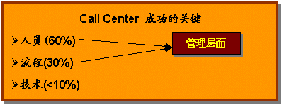 企業(yè)必須牢記在心,成功運(yùn)營呼叫中心的三要素 人員、流程和技術(shù),三項(xiàng)缺一不可,而更重要的是如何適當(dāng)?shù)卣线@三項(xiàng)要素。鑒于以往經(jīng)驗(yàn),呼叫中心的成功與否,人的因素占60%,流程因素占30%,而技術(shù)因素只占10%。這并不表示可以忽視技術(shù)的重要性,技術(shù)一樣很重要。如果沒有當(dāng)今日新月異的科技,企業(yè)便無法實(shí)現(xiàn)呼叫中心的運(yùn)營;而成功地實(shí)現(xiàn)呼叫中心有效的管理與運(yùn)營,關(guān)鍵在于管理能力,也就是對人員及流程的把握。