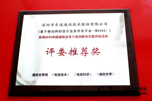 從2010年7月起評選進入征集階段,經(jīng)過長達3個月的層層篩選,最終百個成功解決方案出爐,并由多家主流媒體公示。東進技術(shù)“基于移動網(wǎng)的信令業(yè)務(wù)開發(fā)平臺(MSVAS)”解決方案憑借出眾的實用經(jīng)濟性、安全可靠性、靈活性和成熟性,經(jīng)過兩個月網(wǎng)絡(luò)初選,和近百位運營商層面專業(yè)人士組成的組委會技術(shù)終選后獲此殊榮。
