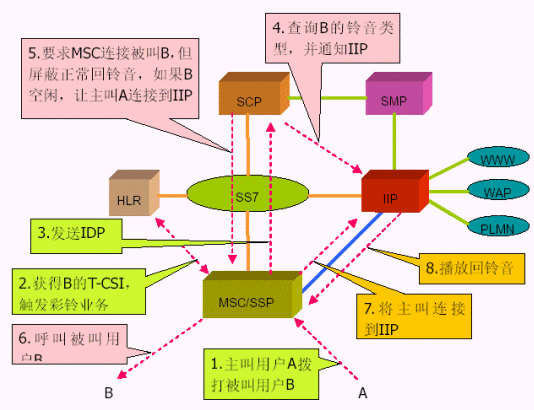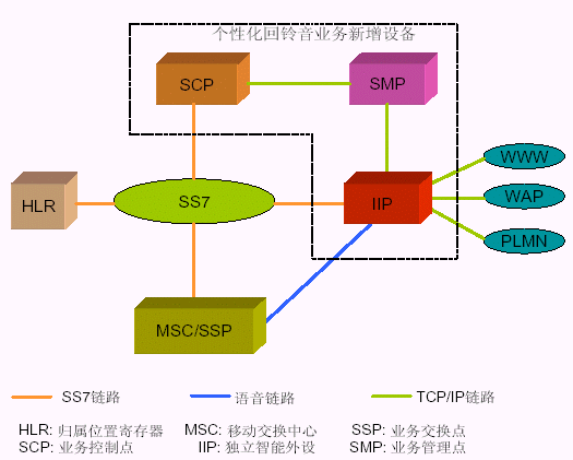 3. 智能網(wǎng)方式使用移動(dòng)智能網(wǎng)中的信令控制節(jié)點(diǎn)(SCP)實(shí)現(xiàn)智能業(yè)務(wù)的業(yè)務(wù)邏輯,新增的智能外設(shè)用于為用戶(hù)提供回鈴音和用戶(hù)管理功能。 個(gè)性化回鈴音業(yè)務(wù)是基于智能網(wǎng)系統(tǒng)的一個(gè)新業(yè)務(wù),在智能網(wǎng)中增加新的業(yè)務(wù)控制點(diǎn)(SCP)和獨(dú)立智能外設(shè)(IIP)。為此只需要為此業(yè)務(wù)加入基于Intel平臺(tái)的SCP和IP即可,前者是智能網(wǎng)體系中的業(yè)務(wù)控制設(shè)備,用于實(shí)現(xiàn)智能業(yè)務(wù)的業(yè)務(wù)邏輯,使用的是Intel高性能的c-PCI平臺(tái),支持高可靠性的冗余備份,提供業(yè)務(wù)呼叫控制和業(yè)務(wù)數(shù)據(jù)維護(hù)功能;后者是智能網(wǎng)獨(dú)立外設(shè),使用的是Inetl Dialogic的相關(guān)語(yǔ)音板卡,用于為個(gè)性化回鈴音用戶(hù)提供語(yǔ)音(回鈴音)、以及業(yè)務(wù)管理等功能。優(yōu)點(diǎn)是無(wú)須改動(dòng)現(xiàn)網(wǎng)上MSC/SSP 的軟件,通過(guò)采用SCP 查詢(xún)被叫用戶(hù)狀態(tài)的方式,只有當(dāng)被叫用戶(hù)處于空閑的情況下,才使用IIP 進(jìn)行處理,可以減少系統(tǒng)負(fù)荷,降低SSP 與IIP 之間話路的占用。缺點(diǎn)是需要MSC支持智能網(wǎng)業(yè)務(wù)。