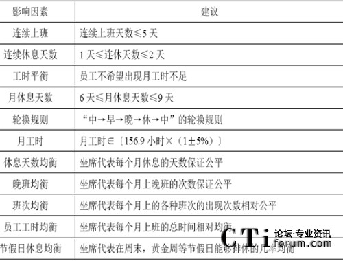 要滿(mǎn)足每半小時(shí)實(shí)際安排的座席數(shù)量不少于需要的座席數(shù)量的要求,首先就需要進(jìn)行班次的設(shè)計(jì),這是為第五環(huán)節(jié)資源規(guī)劃而準(zhǔn)備的。“班次設(shè)計(jì)”是指設(shè)計(jì)出一系列的班次,比如早班,中班,晚班,等等。而將來(lái)只要告訴員工,你下個(gè)月每天各上什么樣的班次即可。在班次設(shè)計(jì)時(shí),需要充分考慮前面提到的一些影響因素:如下所示。