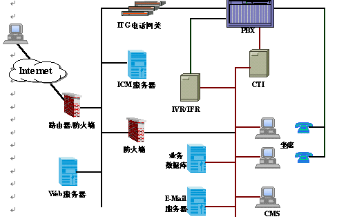 AllCom ICC呼叫中心采用開(kāi)放的和可擴(kuò)展的體系結(jié)構(gòu),通過(guò)高度靈活的系統(tǒng)平臺(tái),為客戶提供Internet多媒體的接入方式。圖中右側(cè)是傳統(tǒng)呼叫中心部分,左側(cè)為Internet呼叫中心所特有的,其中關(guān)鍵部件為Internet呼叫管理(ICM)和IP電話網(wǎng)關(guān)(ITG)。