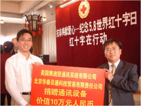 4月,SARS在北京肆無忌彈的橫行,其它國家和地區(qū)也都不同程度地受到SARS的侵害,給人民的生活和工作帶來了極大的影響,人們的身體健康和生命安全受到了威脅。中國紅十字會廣大工作人員對此次疫情迅速響應(yīng),為了支持中國中國紅十字會總開展SARS疫情的救助和捐贈工作,幫助其通過現(xiàn)代化的通訊手段快速準(zhǔn)確的進(jìn)行話務(wù)處理,以便更好地保護人民的生命和健康,4月30日,奧迪堅通訊系統(tǒng)(上海)有限公司聯(lián)合北京華泰貝通科技貿(mào)易有限責(zé)任公司向中國紅十字會總會捐贈了價值約10萬余人民幣的呼叫中心系統(tǒng),軟件以及相關(guān)服務(wù),以實際行動幫助中國紅十字會總會抗擊SARS。