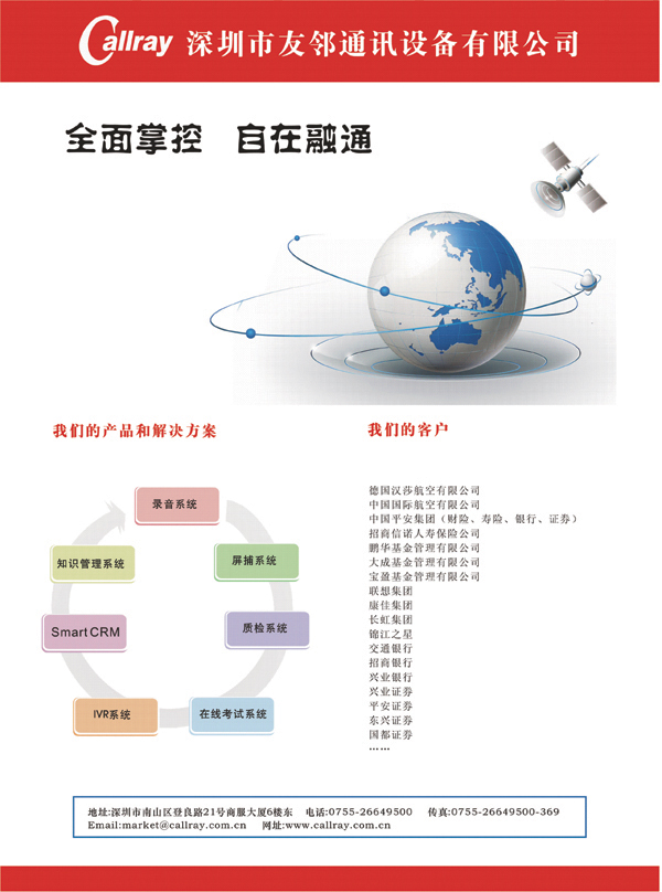 深圳市友鄰通訊設備有限公司是一家以通訊軟件開發(fā)為主的高科技企業(yè)。主要產(chǎn)品AP Suite是基于呼叫中心的工作質量管理系統(tǒng)和軟件,自1997年進行產(chǎn)品開發(fā)和市場開拓以來,AP Suite呼叫中心質量管理軟件日趨完善,得到廣大行業(yè)客戶的一致認同和好評。到目前為止,該系統(tǒng)已成功應用于民航、金融、保險、證券、電信、公安、電力以及政府等多種行業(yè)、部門。