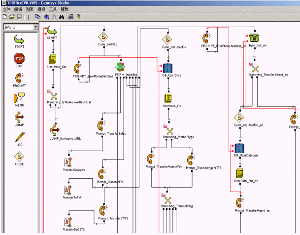GVP提供了界面友好的功能強(qiáng)大的語(yǔ)音應(yīng)用開(kāi)發(fā)工具-Genesys Studio,其中預(yù)定了豐富的控件,用來(lái)實(shí)現(xiàn)菜單語(yǔ)音播報(bào)、DTMF收集以及對(duì)數(shù)據(jù)庫(kù)查詢(xún)等諸多功能。通過(guò)拖放的方式就可以快速的隨心所欲地設(shè)計(jì)出你所需要的語(yǔ)音邏輯應(yīng)用流程,最終編譯產(chǎn)生用于發(fā)布的ASP或者JSP頁(yè)面。應(yīng)用之間可以彼此調(diào)用,提高了語(yǔ)音應(yīng)用的靈活性和可重用性。Genesys Studio還提供了靈活實(shí)用的調(diào)試工具,可以隨意設(shè)置斷點(diǎn)實(shí)時(shí)跟蹤流程的執(zhí)行情況,極大的方便了語(yǔ)音應(yīng)用流程的調(diào)試。