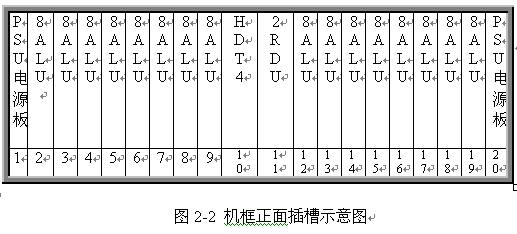 見圖 2 和 3 ,遠端模塊采用 19 英寸標準機框,高度為 5U ,可安裝在各種標準的 19 英寸的機柜中。機框共 20 個插槽,正面插板,反面背板出線。每個機框可插 20 塊各種類型的板件,其中兩邊第 1 第 20 槽固定插電源板 PSU ,中間第 10 號槽固定插數(shù)字中繼接口板 HDT4 ,其余 16 個槽為通用槽口,可插 16 塊各種類型接口板。每塊板為 8 路,一個機框總共 128 話路。調(diào)度接口板 2RDU 固定插第 11 槽,該板不占機框端口。對于自帶交換系統(tǒng),需要安裝一塊系統(tǒng)信號音板 8TDU ,該板固定插 19 槽,占 8 個端口。