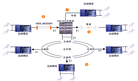 遠端模塊通過標準 2M ( E1 )接口與交換機連接。該接口不受傳輸距離和傳輸設備的限制。常用的傳輸設備有 SDH 、 PDH 光端機(光纜),數(shù)字微波、數(shù)字擴頻, HDSL 調(diào)制解調(diào)器(雙絞線)等。