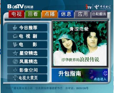 上海IPTV點(diǎn)播節(jié)目達(dá)3000小時,包括電影、電視劇、音樂娛樂、紀(jì)實(shí)節(jié)目、少兒、體育以及教育等欄目。點(diǎn)播節(jié)目改變了“你播我看”的電視被動接受方式,讓用戶可以根據(jù)自己的喜好來選擇喜愛的個性化節(jié)目,大大提高了用戶的喜愛度。值得一提的是,當(dāng)收看電影中途退出的時候,系統(tǒng)提供了“書簽”功能,下一次收看時,便可以從書簽處繼續(xù),方便用戶使用和體驗(yàn)。另外,系統(tǒng)提供的“搜索”功能也讓百姓眼前一亮,尋找自己喜愛的影片就更方便了。