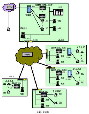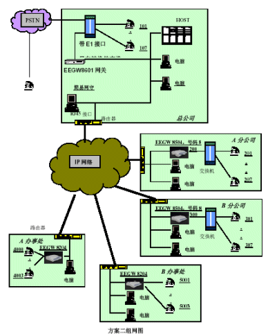 。。本方案有主要配置:總公司配備1臺(tái)EEGW8601E1網(wǎng)關(guān)、四個(gè)分公司分別配備1臺(tái)EEGW8504FXO網(wǎng)關(guān),四個(gè)辦事處分別配備1臺(tái)EEGW8204FXO網(wǎng)關(guān)。在總公司出可以安裝EEGK8001簡(jiǎn)易網(wǎng)閘。