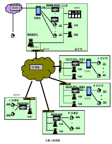 。。本方案有主要配置:總公司配備3臺(tái)EEGW8504FXO網(wǎng)關(guān)、四個(gè)分公司分別配備1臺(tái)EEGW8504FXO網(wǎng)關(guān),四個(gè)辦事處分別配備1臺(tái)EEGW8204FXO網(wǎng)關(guān)。在總公司出可以安裝EEGK8001簡(jiǎn)易網(wǎng)閘。