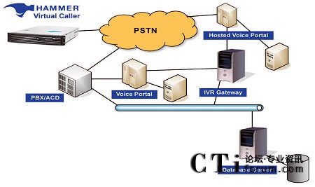 Hammer On-Call IVR測(cè)試關(guān)注呼叫中心的自助服務(wù)技術(shù),以運(yùn)營商網(wǎng)絡(luò)為起點(diǎn)和包括從PSTN接受電話呼叫的PBX/ACD系統(tǒng)、處理電話呼叫的IR(自動(dòng)應(yīng)答系統(tǒng))或Voice Portal(語音門戶)、載有面向用戶型業(yè)務(wù)的業(yè)務(wù)服務(wù)器(如VXML)、用于語音激活型業(yè)務(wù)的語音識(shí)別引擎或者是處理DTMF業(yè)務(wù)的DTMF收集器、文本轉(zhuǎn)換成語音的資源、和用于支持自助服務(wù)環(huán)境下運(yùn)行業(yè)務(wù)的所有后臺(tái)系統(tǒng)。