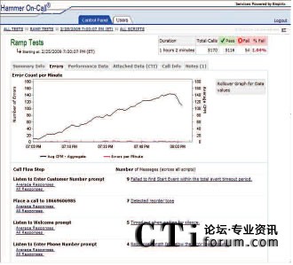 Hammer On-Call IVR測(cè)試使用各種各樣的主叫場(chǎng)景模擬真實(shí)世界用戶交互。通過改變呼叫量和呼叫場(chǎng)景的混合,Empirix測(cè)試專家可以生成指向IVR的模擬真實(shí)世界的呼叫流量。此外,在測(cè)試中,不同的呼叫測(cè)試點(diǎn)上可以使用不同的呼叫率。在測(cè)試過程中經(jīng)常會(huì)用到三種基本呼叫模型及其變體;緶y(cè)試是使用一個(gè)恒定的低呼叫率檢驗(yàn)被測(cè)環(huán)境是否已準(zhǔn)備好接受呼叫;增量測(cè)試是使用一個(gè)固定增量穩(wěn)步增加呼叫量一直到達(dá)峰值呼叫量,然后,增加呼叫量直至超過期望值,檢驗(yàn)系統(tǒng)在峰值時(shí)段內(nèi)是否有額外容量;最后,‘浸透’測(cè)試是在指定的時(shí)段內(nèi)使用一個(gè)恒定的高呼叫率檢驗(yàn)系統(tǒng)穩(wěn)定性。