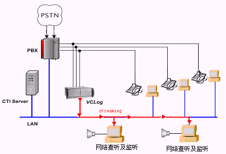 在此項目中,宇高多媒體錄音系統(tǒng)(VCLog)采用時下最為流行、先進的網絡技術(流媒體技術):VCLog網絡查聽及實時監(jiān)聽錄音功能模塊軟件(VCLog LineMonitor)采用流式傳輸的方式,用戶不必等到整個文件全部下載完畢,而只需經過幾秒啟動延時即可進行聽取。當聲音等媒體在客戶機上播放時,文件的剩余部分將在后臺從服務器內繼續(xù)下載。流式傳輸不僅使啟動延時成十倍、百倍地縮短,而且不需要太大的緩存容量,即使在網絡非常擁擠或很差連接條件下,也能提供清晰、不中斷的語音給用戶,大大的降低了網絡的負載,保證網絡資源應用的安全性和穩(wěn)定性;