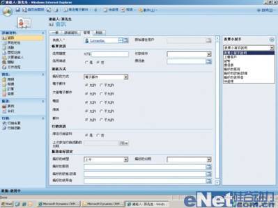 Dynamics CRM同時(shí)也提供了網(wǎng)頁瀏覽器版本的操作者接口。實(shí)際操作網(wǎng)頁版的Dynamics CRM后,我們發(fā)現(xiàn)雖然這種方式不像Outlook可以使用本身的日程表、收發(fā)私人郵件,但是操作上,網(wǎng)頁版本因?yàn)闆]有其它多余選項(xiàng)而顯得更清爽。它的接口與Outlook十分接近,同樣將選擇項(xiàng)目設(shè)置在左下方,并且在點(diǎn)選出行日歷時(shí),一樣會(huì)帶有日期跳動(dòng)至今天的動(dòng)態(tài)效果。除了沒有“在CRM中追蹤”與可以“離線”使用之外,其余功能都具備。