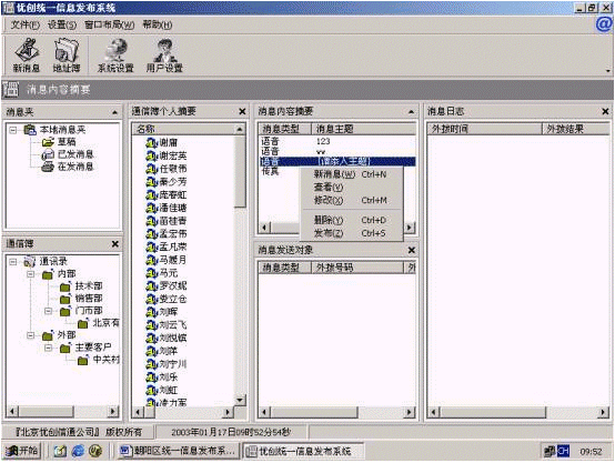 北京優(yōu)創(chuàng)信通科技公司基于完全自主版權(quán)的 SmartMessage Pro架構(gòu),將 Windows OutLook有機擴展,是集CTI、TTS、CMPP、SMTP/POP3技術(shù)的統(tǒng)一消息轉(zhuǎn)換和發(fā)布一體化解決的產(chǎn)品,可以支持Intranet內(nèi)部網(wǎng)的電話語音/傳真、手機短信和Email消息的大量分發(fā)。