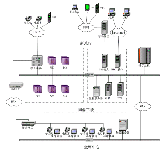 溫州商業(yè)銀行Call Center 項(xiàng)目采用基于Dialogic語(yǔ)音卡的板卡方案,由于坐席分布在兩個(gè)不同地方(新總行和國(guó)鼎),因此,采用了Intel 的Elite 設(shè)備作為IP語(yǔ)音網(wǎng)關(guān)。系統(tǒng)結(jié)構(gòu)如下: