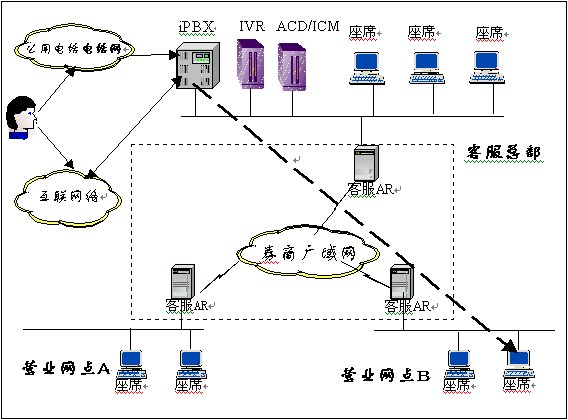 在總部設(shè)立集中的客戶服務(wù)中心完成對全網(wǎng)的人工座席的管理和調(diào)度,由總部的ACD完成對全網(wǎng)人工業(yè)務(wù)的呼叫分配,借助廣域網(wǎng)絡(luò),實現(xiàn)話務(wù)在區(qū)域范圍內(nèi)的接續(xù)。在座席配置上既可以采用集中配置,各營業(yè)部分散配置專家座席的方式。