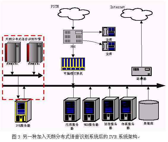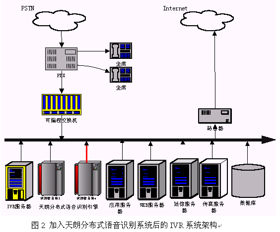 硬件連接:天朗分布式語音識(shí)別系統(tǒng)是通過局域網(wǎng)來把客戶端和服務(wù)器連在一起。因此在硬件上把天朗分布式語音識(shí)別系統(tǒng)聯(lián)入到IVR的一種簡單的辦法是把引擎的所有服務(wù)器接入到系統(tǒng)現(xiàn)有的局域網(wǎng)中,使得識(shí)別服務(wù)器能和IVR服務(wù)器通過TCP/IP通訊即可。連接后的系統(tǒng)架構(gòu)可以用圖2來表示。