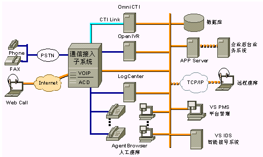 VS CommSuites除了提供傳統(tǒng)呼叫中心功能外,還增加了IPCC功能,是一個(gè)全方位的解決方案,下面是系統(tǒng)的結(jié)構(gòu)圖: