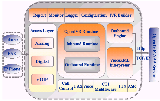 OpenIVR通過了業(yè)界主要的CTI中間件和PBX集成測試,是呼叫中心系統(tǒng)IVR服務器的理想選擇;而集成商只需簡單掌握VoiceXML語言,就可以方便地定制業(yè)務及流程;下面是 OpenIVR系統(tǒng)結構圖: