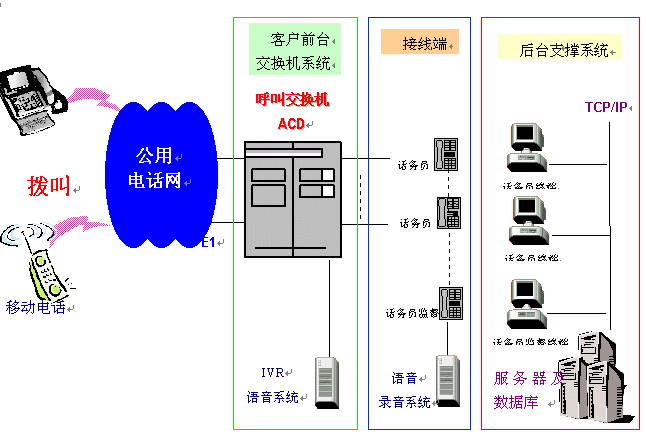 一個完整的呼叫中心解決方案通常由以下核心部分組成:自動呼叫分配(ACD)、交互式語音應(yīng)答(IVR)、計(jì)算機(jī)電話綜合應(yīng)用(CTI)、錄音服務(wù)器、呼叫管理(CMS)等。