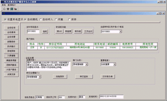 。。提供電話、傳真、電子郵件、因特網(wǎng)、手機(jī)、網(wǎng)絡(luò)電話等多種通訊方式接入和呼出,全天候24小時(shí)服務(wù);無(wú)論以何種方式接入系統(tǒng),都可以用統(tǒng)一的方式進(jìn)行后臺(tái)處理,全面體貼居民的需要,有效擴(kuò)大電力系統(tǒng)的服務(wù)范圍!