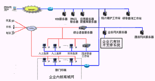 網(wǎng)上服務(wù)系統(tǒng):與INTENET結(jié)合,接受來自網(wǎng)上的呼叫請(qǐng)求,提高服務(wù)和營(yíng)銷的質(zhì)量和效率。