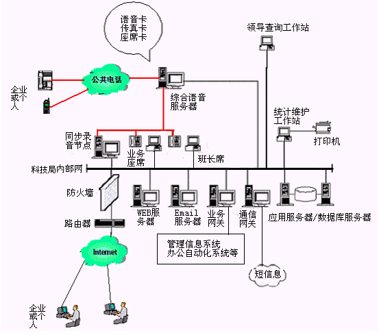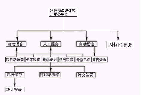 該系統的設計采用先進的三層CLIENT/SERVER網絡體系結構,集目前先進的計算機技術、通信技術、計算機電信集成(CTI)技術、多媒體呼叫接入技術、智能接入交換分配技術、數字語音處理技術、異構系統信息交互技術、INTERNET網絡技術、安全容錯技術、網絡組網技術等于一體,并與地方科技局已有技術支持系統(如MIS系統、辦公自動化系統等)緊密結合在一起,突破時空的限制,通過人工座席、自動語音/傳真、科技局相關人員等為企業(yè)或個人提供電話、傳真、電子郵件、因特網、手機、網絡電話等多種服務形式的周到、快捷、全方位的服務,為企業(yè)或個人與地方科技局之間架起一座密切聯系的橋梁。