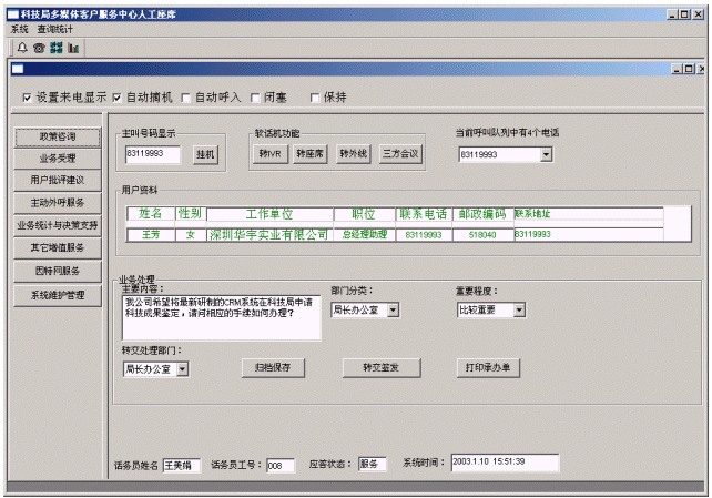 企業(yè)或個人打入電話后,可以選擇人工服務,同座席話務人員直接溝通,由話務人員將企業(yè)或個人反映的問題和提出的建議意見記錄下來,并同時記錄下該客戶的聯系方式,將相關數據添加入系統數據庫;也可以在數據庫的支持下回答企業(yè)或個人對科技成果和政策法規(guī)的咨詢和疑問。企業(yè)或個人也可以選擇自動語音服務方式,根據系統的語音提示輸入按鍵,選擇類別,將自己的投訴和建議以及自己的聯系方式信息以留言錄音的方式保存在系統中。系統同時還支持自動傳真方式,企業(yè)或個人可以通過傳真機打通客戶服務中心,通過按鍵選擇傳真方式,將自己的意見建議等的文本內容傳真給系統,系統自動接受并存入數據庫。