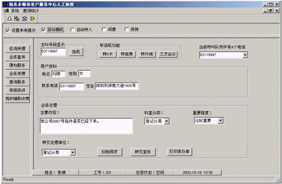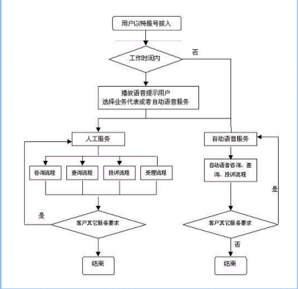 客戶打入電話后,當系統(tǒng)的自動語音應答子系統(tǒng)無法解決納稅人問題時,客戶可選擇人工服務,由客戶服務代表直接接聽納稅人電話,處理并解決納稅人問題。此時納稅人同座席話務人員直接溝通,并同時記錄下該客戶的聯(lián)系方式,將相關數(shù)據(jù)添加入系統(tǒng)數(shù)據(jù)庫;也可以在數(shù)據(jù)庫的支持下回答國家和地方的稅收政策及相關規(guī)定等的咨詢和疑問?蛻粢部梢赃x擇自動語音服務方式,根據(jù)系統(tǒng)的語音提示輸入按鍵,選擇類別,將自己的投訴和建議以及自己的聯(lián)系方式信息以留言錄音的方式保存在系統(tǒng)中。系統(tǒng)同時還支持自動傳真方式,客戶可以通過傳真機進入本系統(tǒng),通過按鍵選擇傳真方式,將自己的意見建議等的文本內(nèi)容傳真給系統(tǒng),系統(tǒng)自動接受并存入數(shù)據(jù)庫。