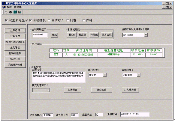 客戶打入電話后,當系統(tǒng)的自動語音應答子系統(tǒng)無法解決客戶問題時,客戶可選擇人工服務(wù),由企業(yè)客戶服務(wù)代表直接接聽客戶電話,處理并解決客戶問題。此時客戶同座席話務(wù)人員直接溝通,并同時記錄下該客戶的聯(lián)系方式,將相關(guān)數(shù)據(jù)添加入系統(tǒng)數(shù)據(jù)庫;也可以在數(shù)據(jù)庫的支持下回答接受查詢卷煙/價格/限額/新品種、卷煙經(jīng)營規(guī)范制度/卷煙專賣政策法規(guī)咨詢、通報最近暢銷卷煙的限額情況/通報最近增加的新品種/煙草公司召集的活動通知、投訴和舉報違法經(jīng)銷行為、卷煙預訂、電話訪銷、滿意度調(diào)查等。