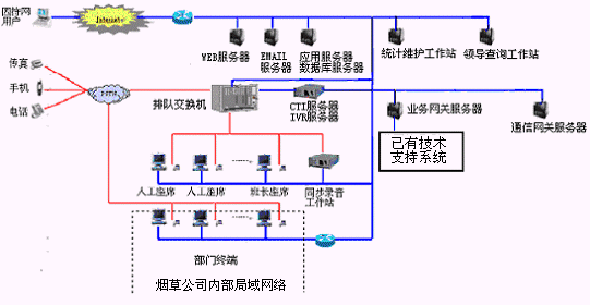 該煙草公司呼叫中心主要是由帶語音板卡的工控機或排隊交換機、CTI服務(wù)器、IVR(交互式語音應答)/IFR(交互式傳真應答)子系統(tǒng)、人工座席子系統(tǒng)、應用服務(wù)器、數(shù)據(jù)庫服務(wù)器、業(yè)務(wù)網(wǎng)關(guān)子系統(tǒng)、通信網(wǎng)關(guān)子系統(tǒng)等硬件設(shè)備和應用軟件組成。