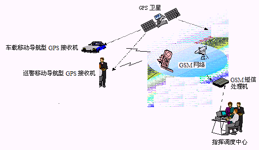 巡警利用移動終端(帶手機(jī)通信功能的GPS接收機(jī))發(fā)出報(bào)警信號,通過GSM系統(tǒng)送到指揮調(diào)度中心。