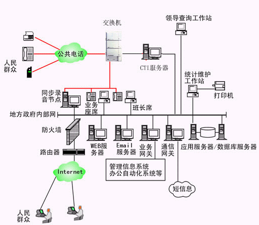 本系統(tǒng)物理結(jié)構(gòu)由帶語音板卡的工控機或排隊交換機、座席分流器、CTI服務(wù)器、IVR(交互式語音應(yīng)答)/IFR(交互式傳真應(yīng)答)服務(wù)器、業(yè)務(wù)代表座席、班長座席、統(tǒng)計維護管理工作站、因特網(wǎng)(WEB)服務(wù)器、電子郵件(EMAIL)服務(wù)器、數(shù)據(jù)庫/應(yīng)用服務(wù)器、業(yè)務(wù)網(wǎng)關(guān)服務(wù)器、錄音留言工作站、領(lǐng)導(dǎo)查詢工作站、網(wǎng)絡(luò)系統(tǒng)等構(gòu)成。