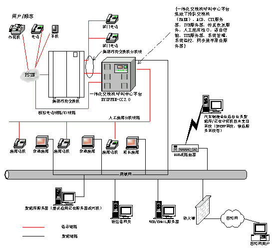 基于一體化交換機的汽車制造企業(yè)多媒體客戶服務中心系統(tǒng)產(chǎn)品BYQCZZ-CC2.0的網(wǎng)絡拓撲結構如下: