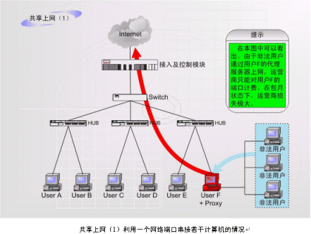 非法運(yùn)營(yíng)情況之二:如上圖中的F用戶(hù)作為運(yùn)營(yíng)商的合法包月用戶(hù),上網(wǎng)服務(wù)開(kāi)通以后,在自己的計(jì)算機(jī)中安裝代理服務(wù)軟件或者安裝路由器,這樣就可以隨時(shí)糾集若干住戶(hù)分?jǐn)偘沦M(fèi)用,甚至私設(shè)網(wǎng)吧。