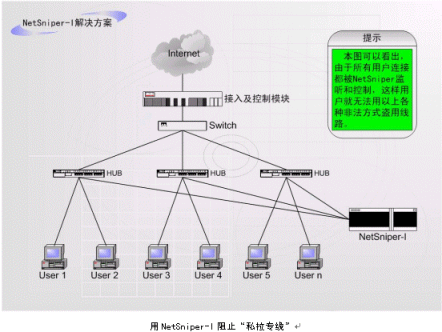 (4)"NetSniper網(wǎng)絡(luò)尖兵"使用起來(lái)非常方便,和運(yùn)營(yíng)商現(xiàn)有的設(shè)備配合極其簡(jiǎn)單:不需要改變現(xiàn)有的網(wǎng)絡(luò)結(jié)構(gòu)、不影響網(wǎng)絡(luò)的性能、與用戶(hù)無(wú)關(guān)、集中維護(hù)、控制模式靈活。